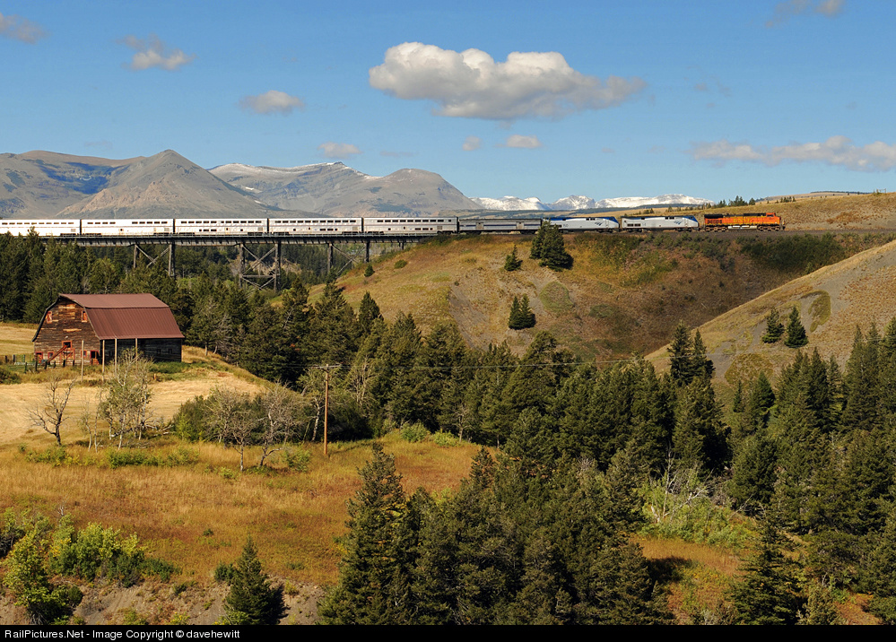 AMTRAK IN TROUBLE. After visiting the Columbia gorge I made my way over to Marias pass and the Glacier National Park. This Amtrak train headed East from the pass and then stopped at East Glacier. A couple of hours later a BNSF locomotive appeared and proceeded to haul the train toward central Montana.