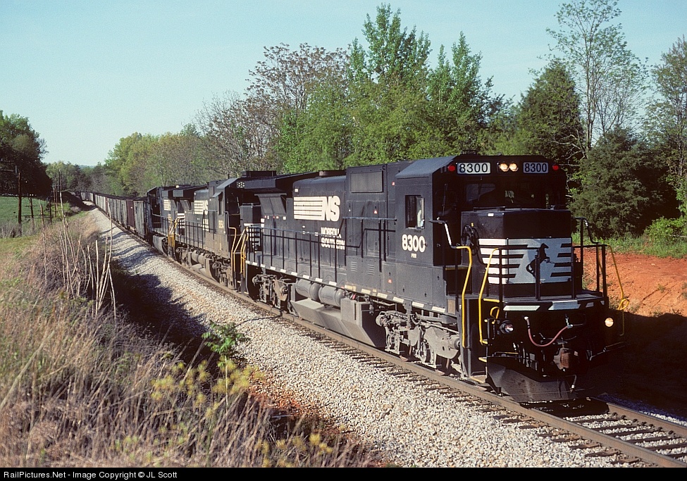 The NS "class unit" for the former Conrail standard cab C40-8s leads a southbound coal train through Wirtz. NS 8300 received an early repaint, considering that Conrail had been gone less than a year when this image was taken. This was also one of the few times I managed to catch red markers burning after the Conrail split.