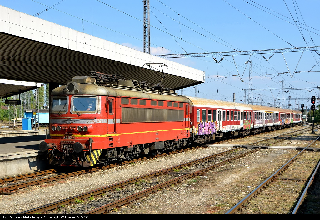 | BDZ 45 169-0 built by Skoda is arriving at the Sofia main railway station with a passenger train. Unfortunately, as in many other European countries, the passenger coaches have been the victim of graffiti vandals. |