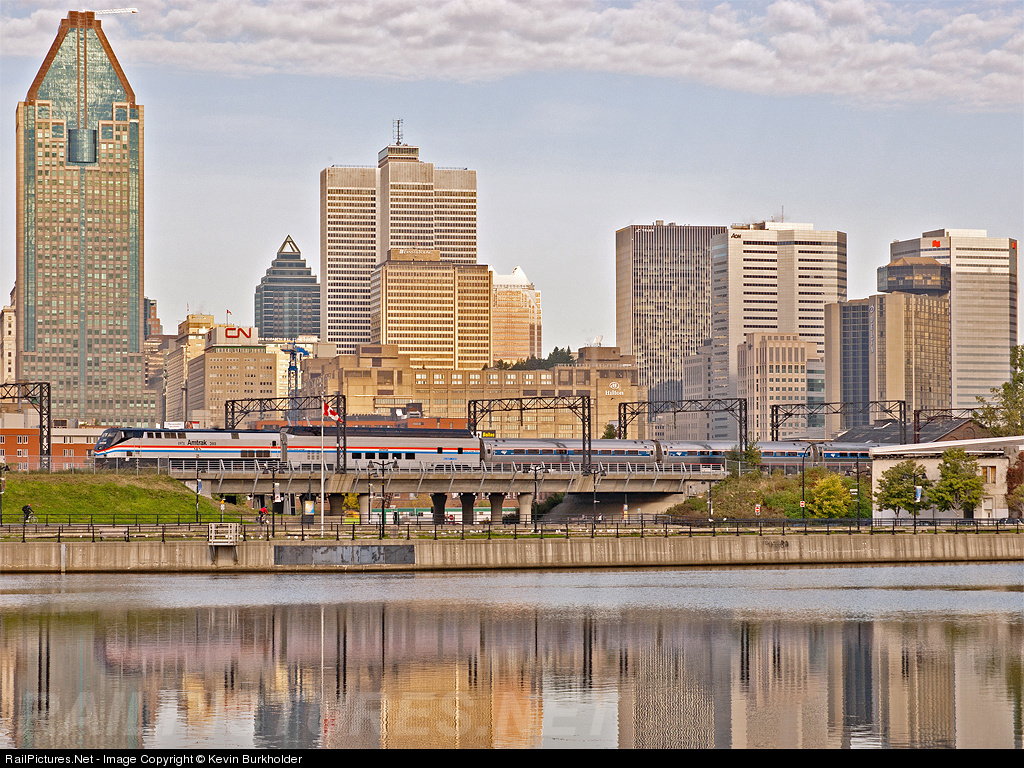 | Amtrak's Adirondack train 68 is seen exiting the City of Montreal on Friday, October 7, with the CN building looming over the train. Many more photos at http://steelwheelsphotography.com. |