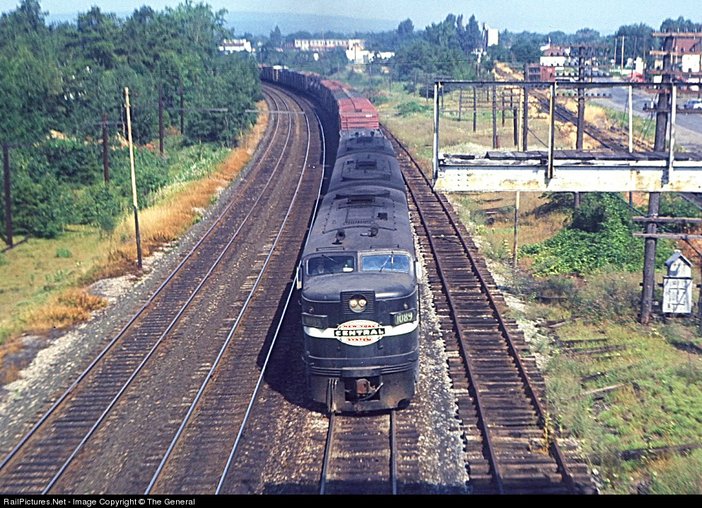 | Alco A-B-A is eastbound on the Water level route at Carman N.Y., (between Schenectady and Albany). Track to right ramps up and swings left over Mohawk Division to reach South Schenectady on the paralleling West Shore route. Most eastbound freight trains crossed over to the West Shore at Hoffmans, west of here to reach Selkirk Yard or by-pass Albany. |