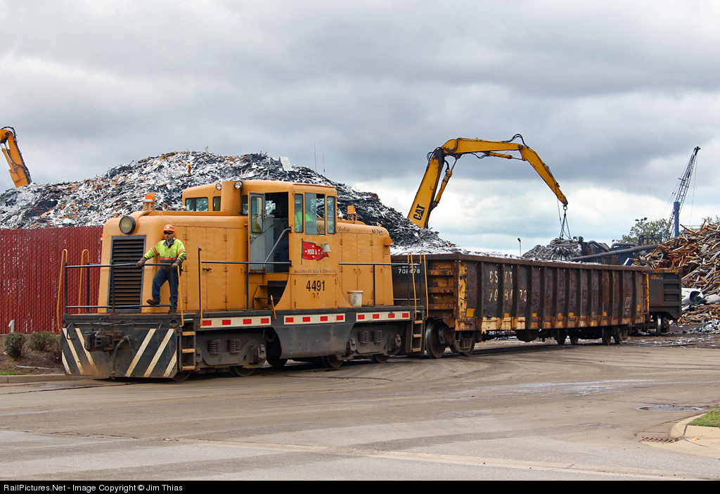 | MBD&T 4491 is one of three locomotives that work at Louis Padnos Iron & Metal Company in Holland, MI. The crane in the background loads gondolas with the shredded scrap metal, and each car is then moved to another spur track where CSX will eventually take over control of the load. This is the first photograph of an MBD&T locomotive on RP. |