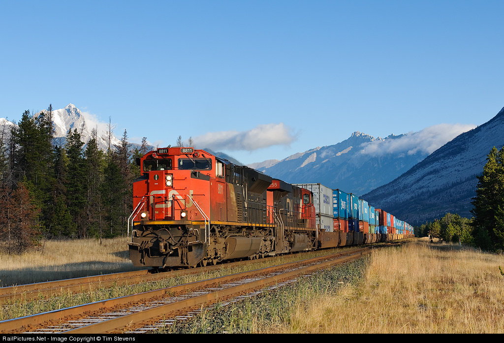 | CN SD70M-2 8811 and CN ES44DC 2255 lead a rare train Q197 towards Jasper. This train originated in Memphis, TN and is heading to the Port of Prince Rupert, BC. |