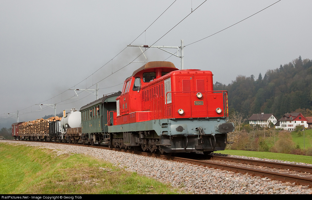 Former SBB diesel locomotive Bm 6/6 18503, built in 1954 and privately owned by Schorno Locomotive Management Winterthur nowadays, with a freight train to Fischenthal on the occasion of the yearly railway vehicle meeting in Bauma. The locomotive has two Sulzer prime movers of 625 kW each.