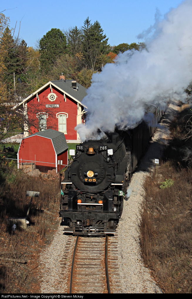 | Sporting MSU Spartans flags and a couple pumpkins, NKP 765 rolls past the Howell depot on its return trip back to Fort Wayne after a couple weekends of Fall color trips. The original plan was to have the MSU flags waving through down town Ann Arbor, and past the U of M campus to have some fun but were ordered to take the flags off the engine before leaving the AA/GLC interchange. |