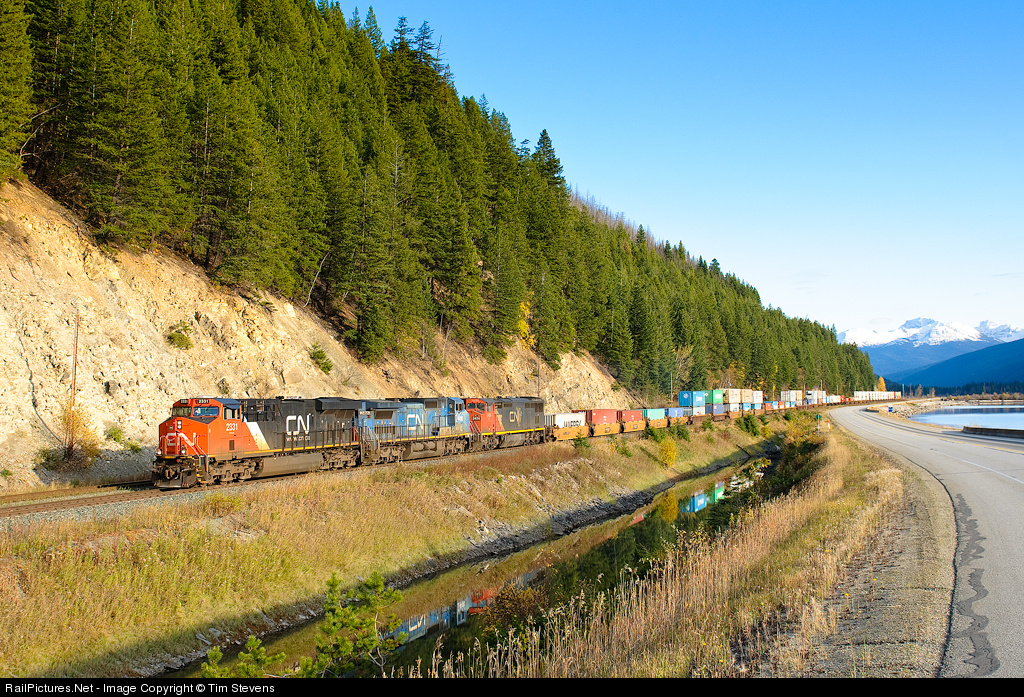 CN's Hotshot, Q111 cruises west on the Albreda Sub with a not so typical lashup. Usually this train rates the best power CN has, however, today ES44DC 2331, IC C40-8W 2466 and C40-8M 2436 provide the power up front while SD70M-2 8838 was shoving on the rear of this 161 car train.