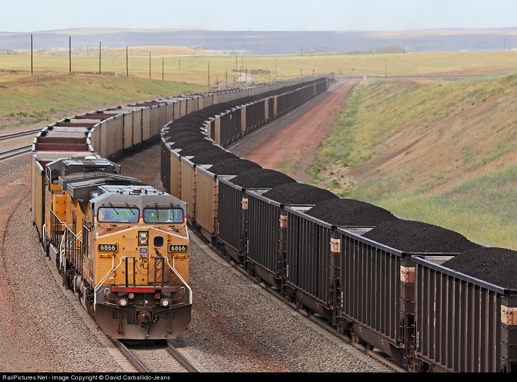 The Fast and the Slow On the left, UP 6866 and another UP unit are the DPUs of an empty coal train, bound for Black Thunder Mines, flies down Logan Hill at track Speed. On the right, a loaded coal train crawls at about 15 MPH up the hill. This is just your typical action on the Powder River Basin as the railroad moves this black gold across out country.