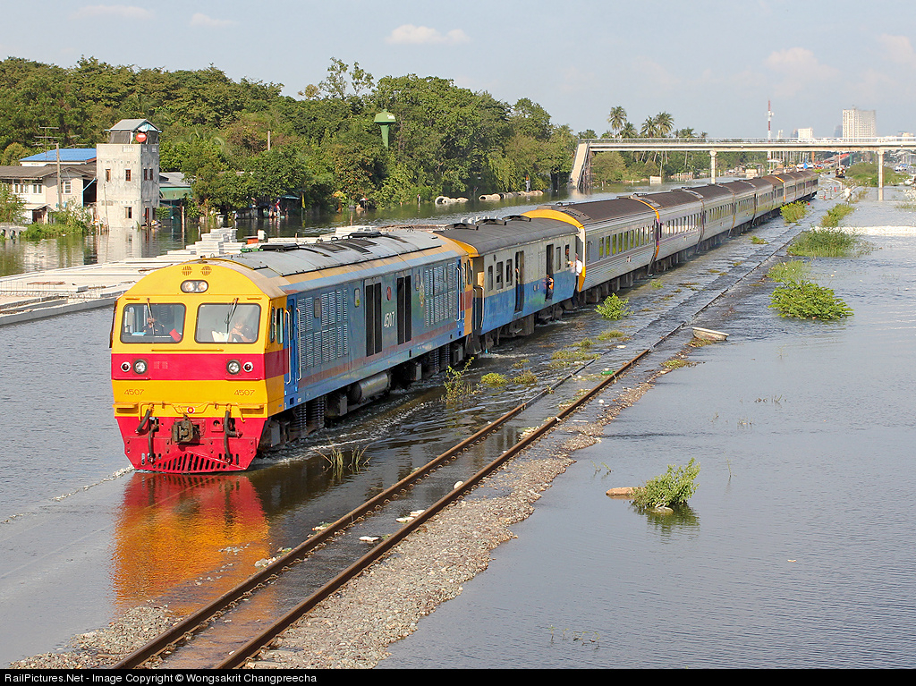 The biggest flooding on the southern track in Thailand and the special express train number 35 from Bangkok to Butterworth pass the flooded track at Bang bamru station.