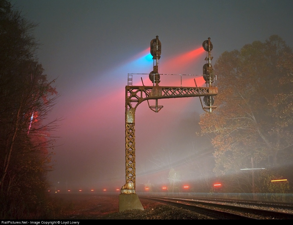 A foggy morning at Hilldale. A Westbound passes under the colorful glow of a classic cantilever, which illuminates a clear signal halfway through the exposure. an 870 second exposure @ f4.5, ISO 200
