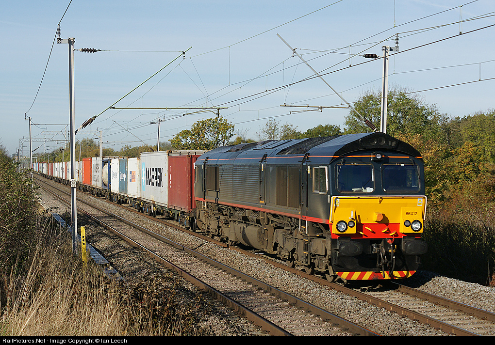 | Ex- DRS 'Malcolm' liveried 66412,now in Freightliner ownership,passes Althorp Park on a Lawley Street to Felixstowe liner. |
