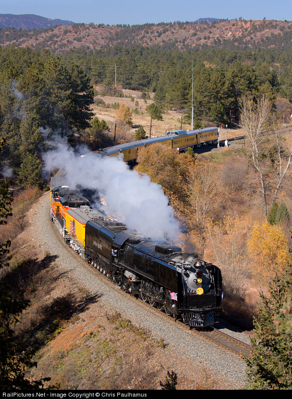 The Arizona - New Mexico Centennial Special runs south into Colorado Springs on a picture-perfect fall day. The UP 844 and Southern Pacific Heritage unit brought out the crowds as they made whistle stops in Castle Rock and Palmer Lake on their journey down the Joint Line toward Colorado Springs. Learn more at Front Range Railfanning.