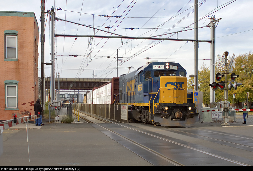 South Amboy was once a bustling railroad town which included a busy station, large freight yard, engine terminal, shortline, and junction of two electrified main lines. Now all that remains is the double-tracked NJT North Jersey Coast Line and junction with Conrail's Amboy Secondary, the Church Running Track, and modern high-level platform station seen in the distance. Here, weekly Conrail local SA31 crosses John St. on its way to Lakewood. The building on the left side of the image is the former Raritan River Railroad headquarters and offices.