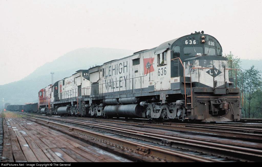 Three Lehigh Valley Alco C628's, (636 and 632 in "Snowbird" attire) lead an eastbound departing Coxton Yard at Pittston Junction in the late summer under threatening skies. This Allentown bound train is crossing the Lackawanna River, as well as curving northward onto the Lehigh Valley’s Mountain Cutoff. There, it will make a large loop to head south, avoiding the original line through Wilkes-Barre.