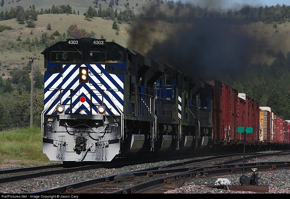 It is July of 2010 and the Mullan Tunnel project is in full swing. The drainage from the tunnel work is giving the locomotives some "highlighting".... MRL4303 is lifting 1/2 of a manifest out of Austin......