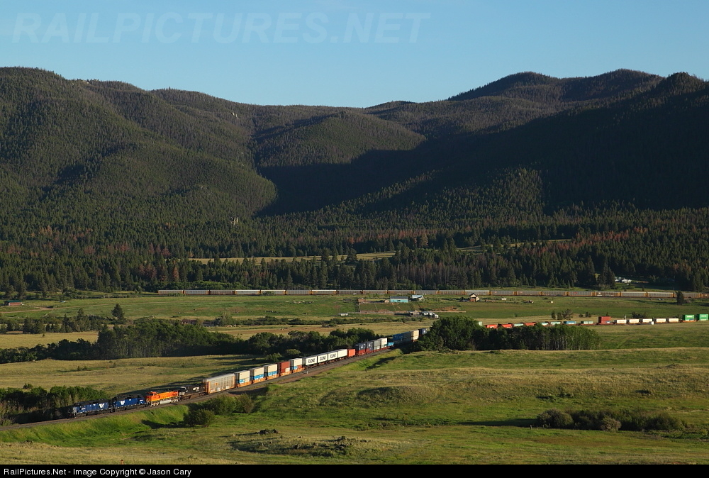 The day draws to a close. MRL 252 gives a helping hand to a westbound Intermodal flood re-route. The location is Austin "Loops", a series of horseshoe curves designed to lift the tracks out from the bottom of Greenhorn Creek drainage. The design bypassed the original survey that would have used a tunnel and large trestle to span Skelly Gulch.