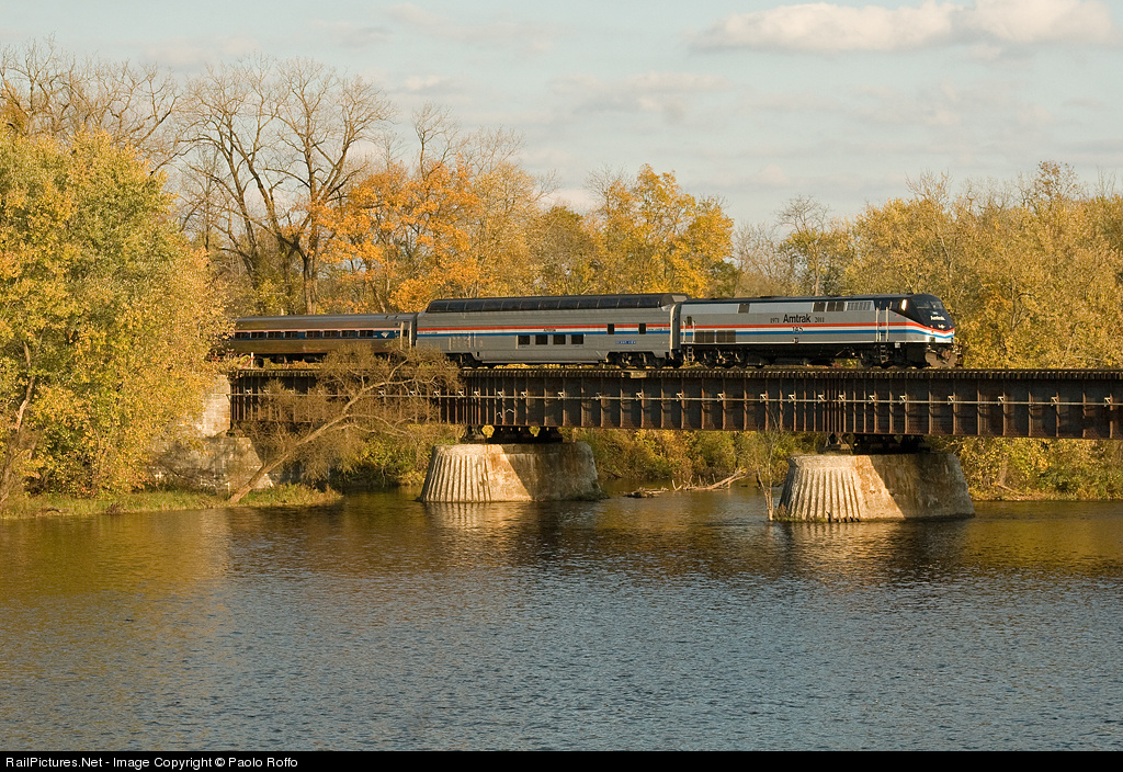 | Retro Style. The southbound Adirondack flies over the Hudson en route to Saratoga Springs, Albany-Rensselaer, and New York. The lead motor and dome car are decked out in the Phase 3 colors not seen in some years before Amtrak debuted its Heritage program. |