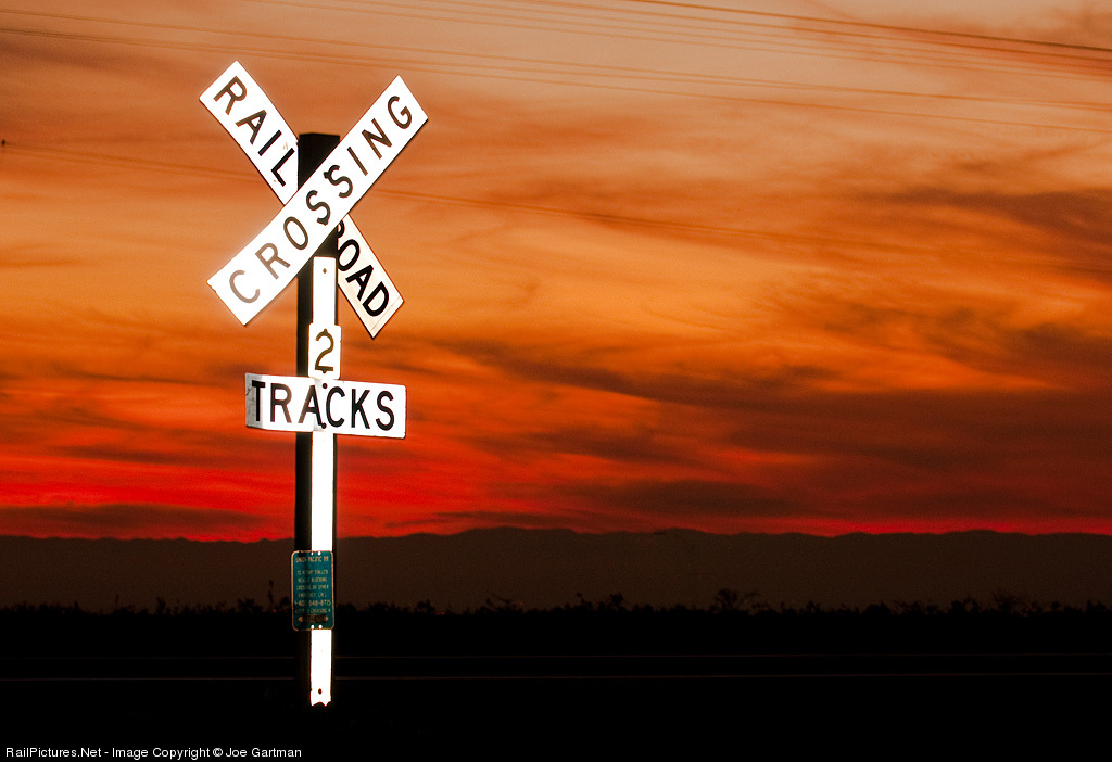 A crossbuck stands guard over a private grade crossing under a dramatic post-sunset sky.