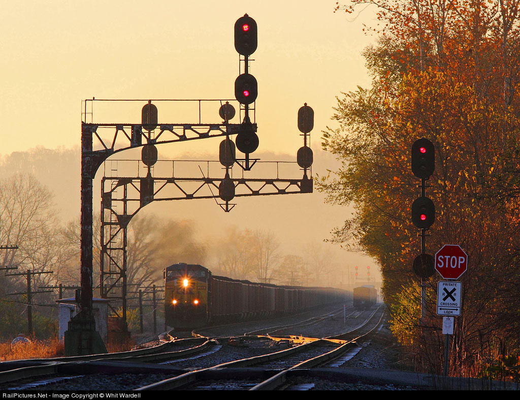 Fall in Ohio - some color left in the trees, a light fog in the air and little frost on the ground as a coal train works it's way by Vauces Center Siding.