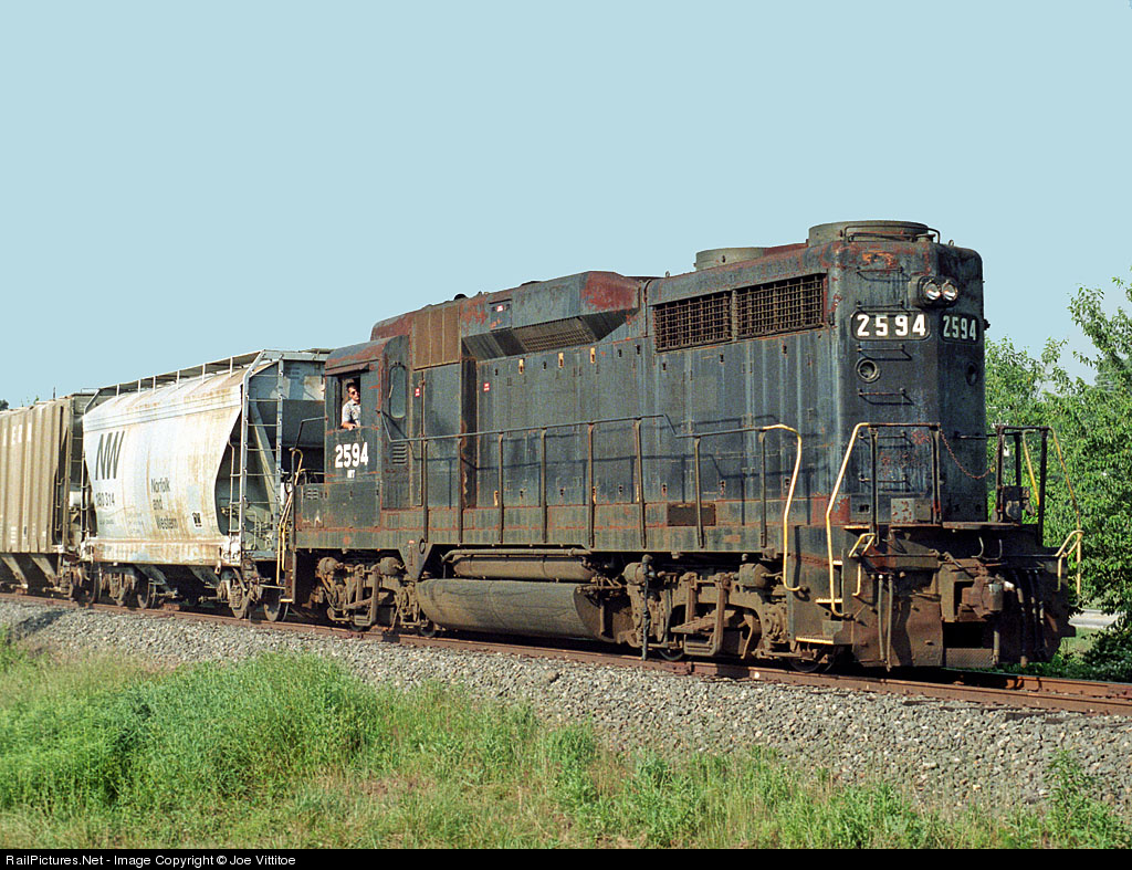 Former Southern Railway GP30 2594 working now for the Hartwell leads a cut of cars north. Today she resides in her original Southern paint at the Tennessee Valley Railway Museum.
