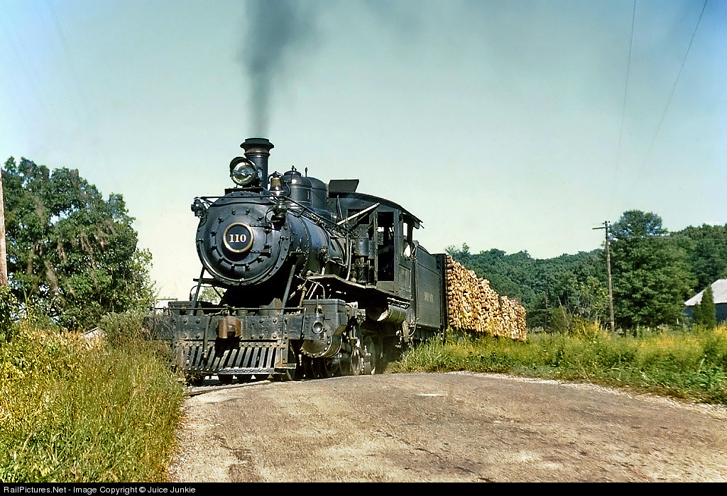 Smoky Mountain 4-6-2 No 110 was built by the Baldwin Locomotive Works in November, 1911 for the Little River Railroad in Tennessee. She has 47" drivers, 16 x 22 inch cylinders, operates at 180 psi boiler pressure, and can exert up to 18,334 lbs of tractive effort. She is the smallest standard gauge 4-6-2 Pacific ever built and spent her first 29 years hauling logs for the Little River railroad. Her middle driver was blind (no flanges) to facilitate the very sharp curves of the logging railroad. In 1940 she was sold to the Smoky Mountain Railroad, a short railroad that ran from Knoxville, Tennessee to Sevierville, Tennessee, and continued in service into the 1950's. She was later purchased by the modern Little River railroad and in 1975 returned to steam. She is currently in excursion service for the Little River Railroad in Coldwater, Michigan. This image from my collection was taken along the Smoky Mountain's line in Tennessee in 1954.