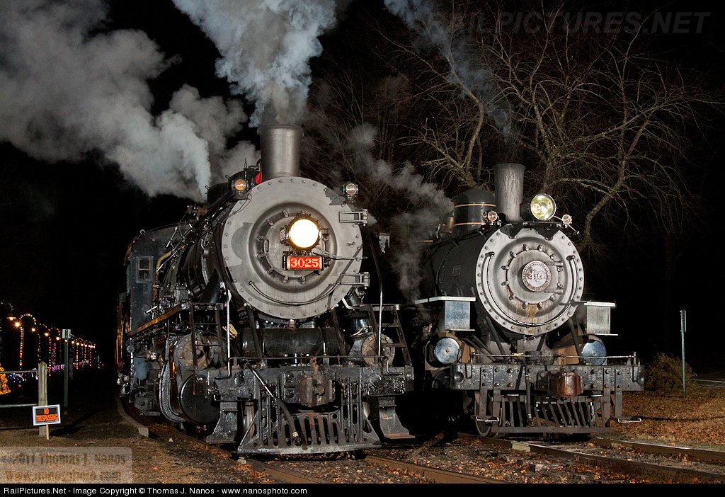 | Meet at Deep River. Two sections of the Valley Railroad's North Pole Express meet at Deep River Landing. The first section, powered by #40 waits on the main as the second section led by recently restored #3025 heads north. This was the first evening of revenue runs for the newly restored Chinese SY. Two Lumedyne flashes triggered off of a Canon EOS 50D with a Sigma 18-50mm f/2.8 EX DC |
