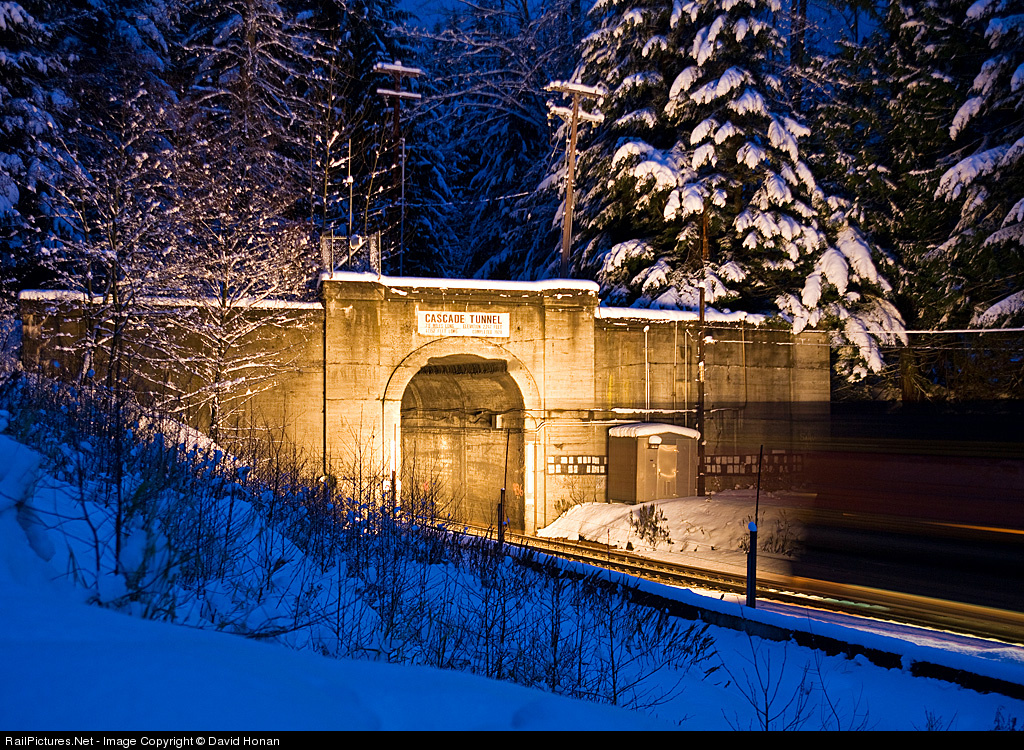 In the blue gloom of a winter evening's twilight, the headlights of an eastbound stack train illuminate the west portal and interior of Cascade Tunnel. Ahead, pierced only by the light carried by the train, lie 7.8 miles of absolute darkness deep below the summit of Stevens Pass.