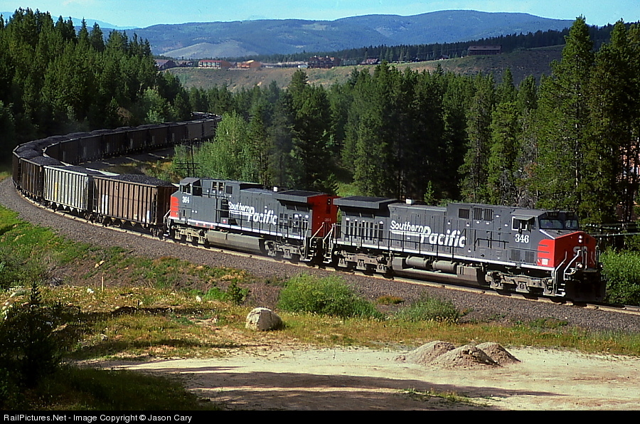 The grades and curves of Winter Park hill are the biggest challenge for trains moving east across SP's Moffat route. The grade has been used as a test bed for many EMD and GE demonstrator locomotives. On this day, an Eastbound coal load is at walking speed blasting up the hill.