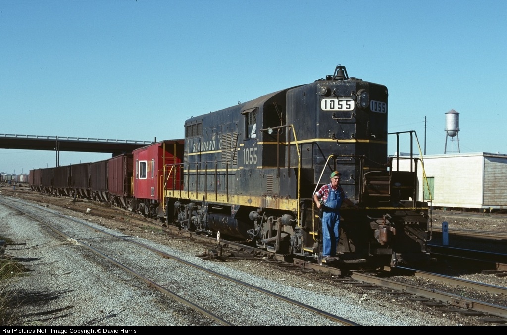 | ACL once had their own Montgomery shops and yard near Bell Street tower, but abandoned both after moving into L&N's S&NA Yard in the 1960s. At the joint facility a few years later, SCL 1055 has an L&N caboose and hoppers in tow as a switchman rides the footboards |