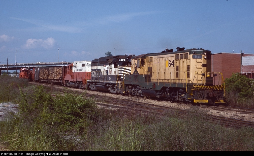| ICG acquired some ex-Reading GP7s that had been in RDG's 600-series, and fit them into the ICG roster by dropping the first '6'. With a bright spot of fresh yellow over the unwanted 6, ICG64 waits at the north end of the yard with the Prattville mill turn so that the Artesia train just coming into view can head out first. |