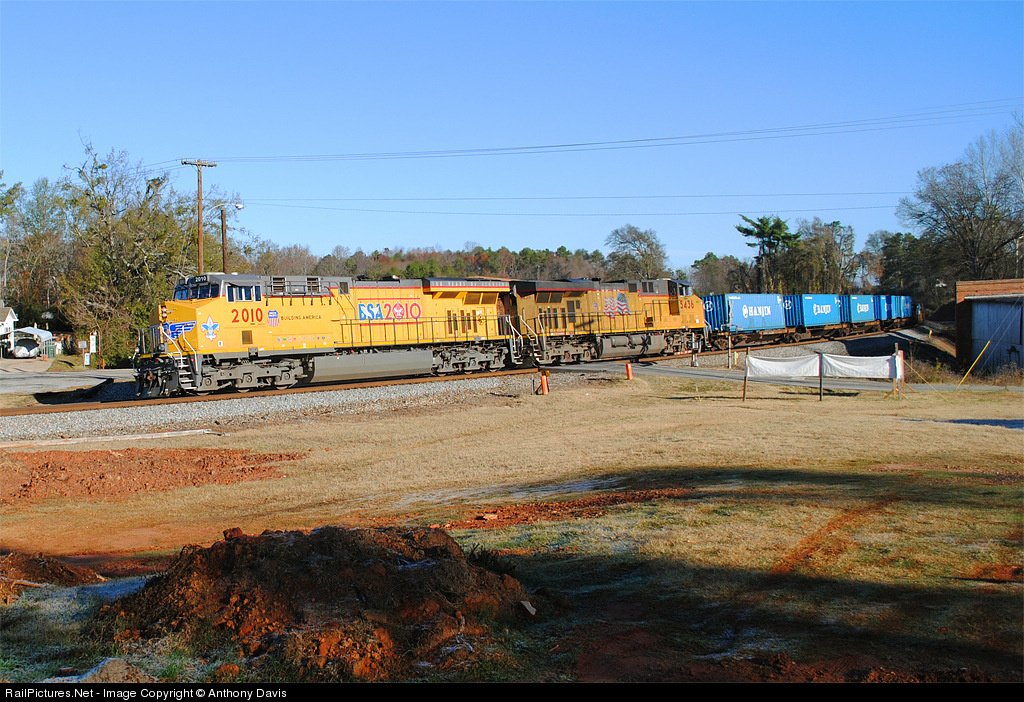 | Boy Scouts Visit the South! UP 2010, the Boy Scouts of America 100 year Anniversary commemorative unit, makes a rare appearance in these parts seen leading NS 221 on a chilly December morning as patches of overnight frost are still evident. This location was one of the few in the area where the light swung for morning southbounds since the light is mostly only good for morning northbounds. |