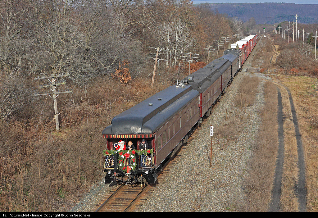 Santa rides the CP past MP 551 as the 15 car CP Holiday Train departs Oneonta, rolling NB for its next show at Cobleskill. Santa might have been a little warm as the detector at Colliersville (547.8) read out 63 degrees on this fine late Fall day. The 4 business cars on the end are Smokey Smith, N.R. Crump, Mt. Royal, and Strathcona.
