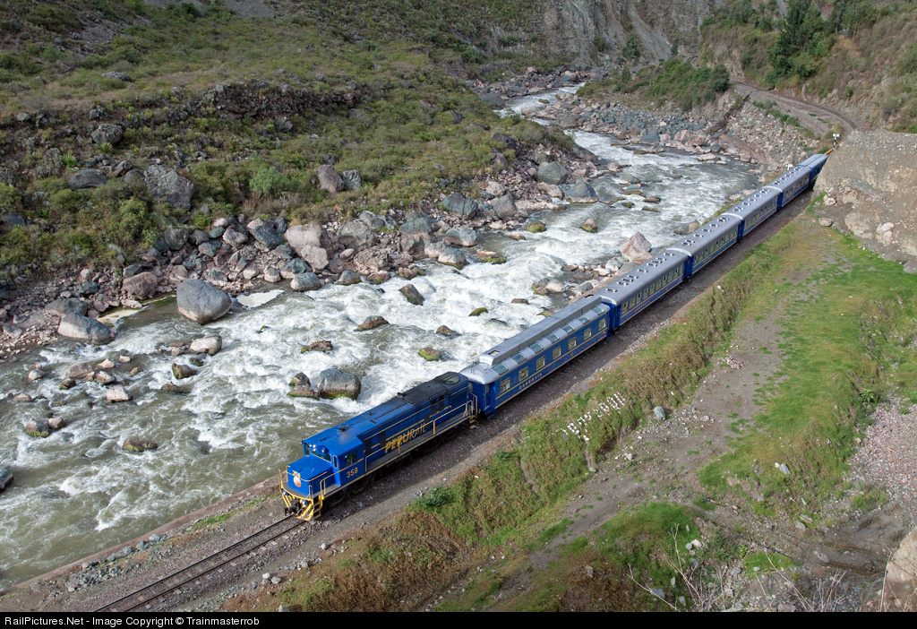 | Perurail 358 rolls east along the Urubamba River, with a load of tourist headed to Ollantaytambo. Early 2010 this section of the line was washed out by a major flood that was the worst in the area in at least 40 years. |