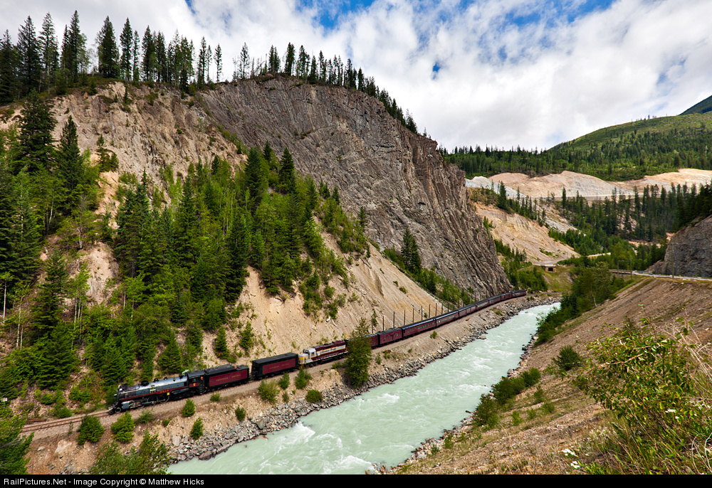 | Heading down the Kicking Horse River Canyon, 2816 steams past the old abutments of the recently rerouted trans-Canada highway before heading under the new and impressive highway bridge.