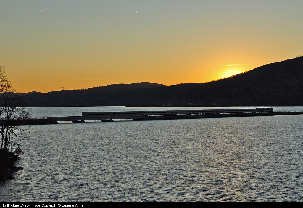 | Sunset on the Hudson River finds a Metro North Hudson Line train from Poughkeepsie to New York City's Grand Central Terminal, just north of Peekskill, crossing the causeway that seperates Annsville Creek from Peekskill Bay. |