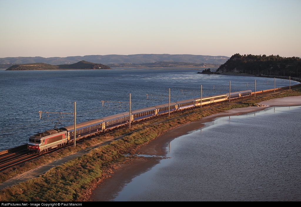| The Paris to Port Bou LUNEA sleeper train, this mark could be translated by MOONEA, leaved Paris at 10PM. 9 hours later, along the Mediterranean sea, tracks cross the Bages and Sigean pond between Narbonne and Perpignan. Port Bou head line is located on the extreme South West Spain border. |