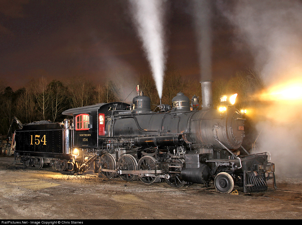 | Former Southern Railway 2-8-0 154, restored and operated by the Gulf & Ohio Railways / Knoxville & Holston River Railroad, rests after three days of pulling Christmas Santa Trains on the Three Rivers Rambler in downtown Knoxville, TN. 154 will operate on the weekend of December 16-18th to close out the 2011 Rambler operating season. This locomotive was built in 1890 and sat in a city park in Knoxville for better than 50 years before being restored by the G&O. |