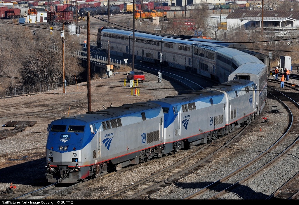 AMTK 189 (P42DC) gets underway again after a lengthy delay due to two cars jumping off the tracks. After separtating the engines and remaining coaches from baggage car 1242 and coach car 39028, the train reassembled and finished the journey to Denver's Union Station.