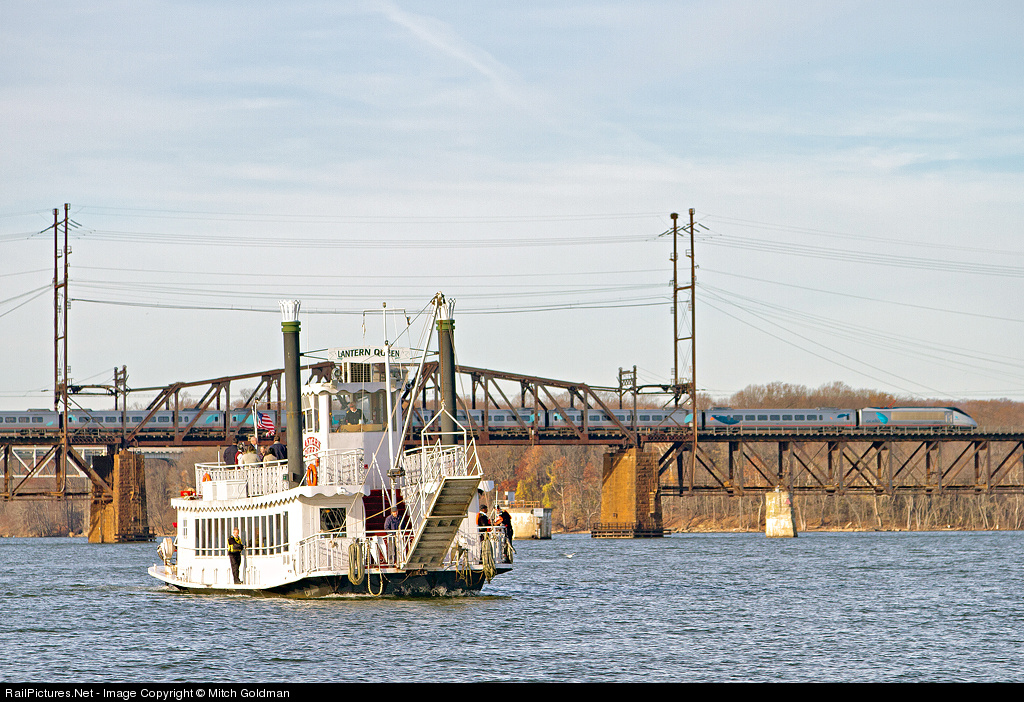 An Amtrak Acela Express takes the quick route over the Susquehanna River as the Lantern Queen, a Mississippi Riverboat replica, returns from a more leisurely excursion.