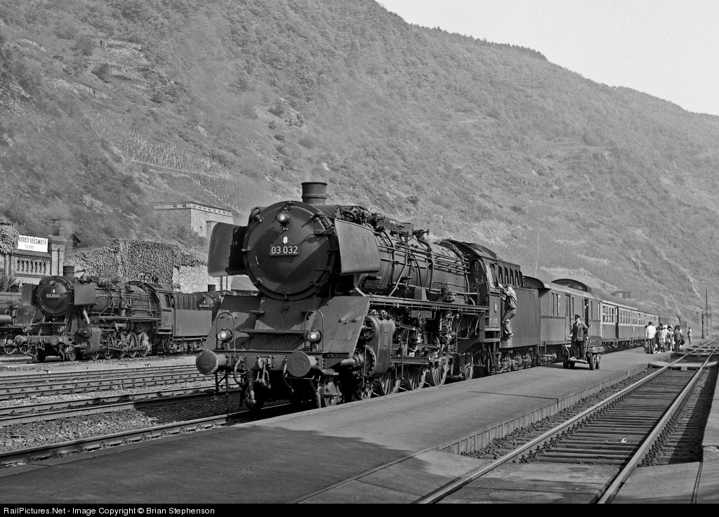 Former Reichsbahn standard light Pacific No 03 032 built in 1931 arrives at Cochem with the 09.22 Koblenz to Trier Eilzug. Cochem bahnbetriebswerk (BW or shed) can be seen in the background with a BR (class) 50 2-10-0 on show that was stationed there for banking (pusher duty) freight trains up through the Kaiser Wilhelm tunnel and onwards to Urzig - a distance of 24 kms.
