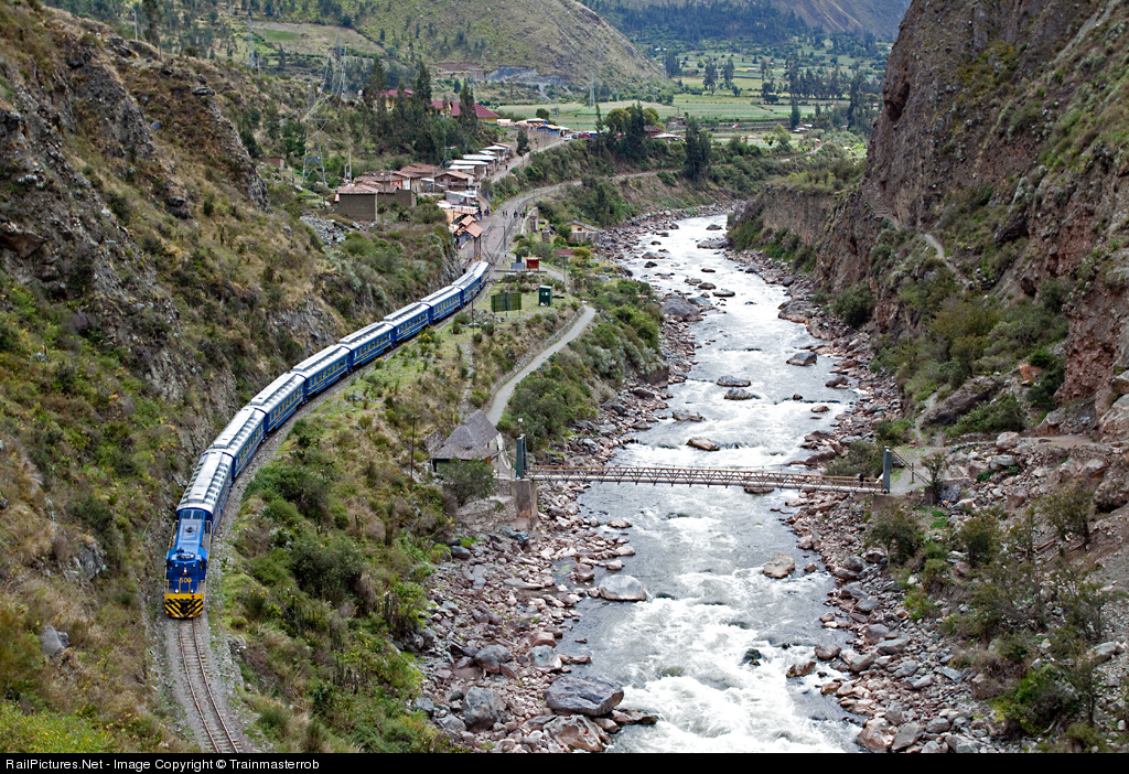 | Deep in the heart of the Sacred Valley the newest locomotive to the Peru Rail 3 foot gauge is #500 (2nd) hauling a string of coaches through the town of Piskacuchu, or as the tourist know it as KM 82. This is the starting point of the 47 km hike on the famous Inca trail. |