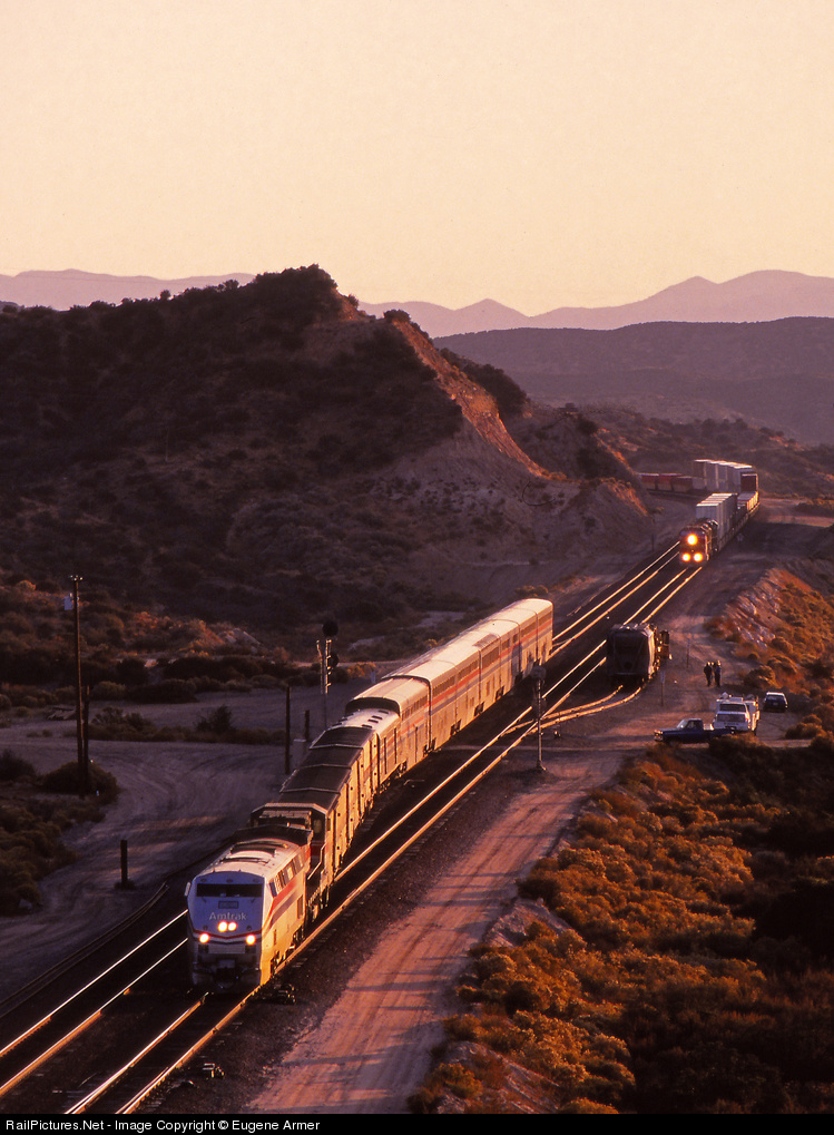 | Sunrise at Summit, and an AT&SF doublestack waits in the background for Amtrak's late running Southwest Chief to overtake and continue its journey down Cajon Pass to Los Angeles. The second locomotive is GE B32-8WH # 519. |