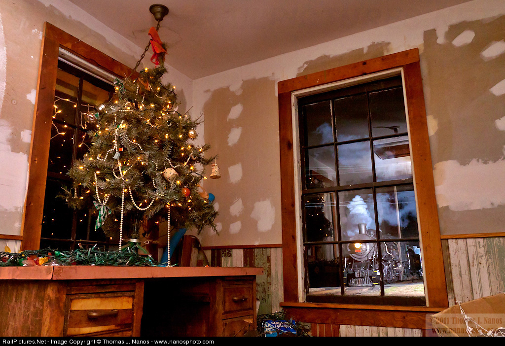 North Pole Express and a Christmas tree. The Valley Railroad's newest locomotive, 2-8-2 No. 3025, pulls a train full of families as they visit with Santa and his elves. The train is pulling north through Chester, CT, and past the station (not the original one, though - that is located about 150 yards to the west, and currently is a residence). Two Lumedyne flashes triggered off of a Canon EOS 50D with a Sigma 18-50mm f/2.8 EX DC