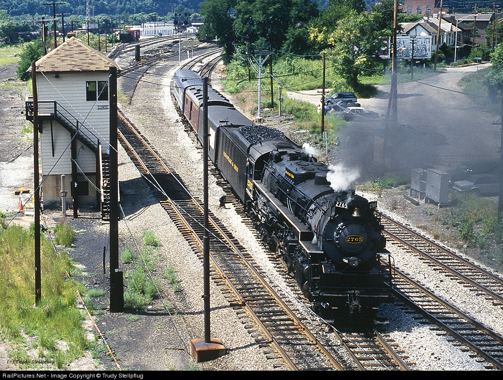 | NKP 765, disguised as C&O 2765, backs up thru the Interlocking at the Glenwood Jct. Tower. The engine will back up to Laughlin Jct. where the engine will be wyed before reassembling its train to head back to Station Square in downtown Pittsburgh, PA for passengers to board. |