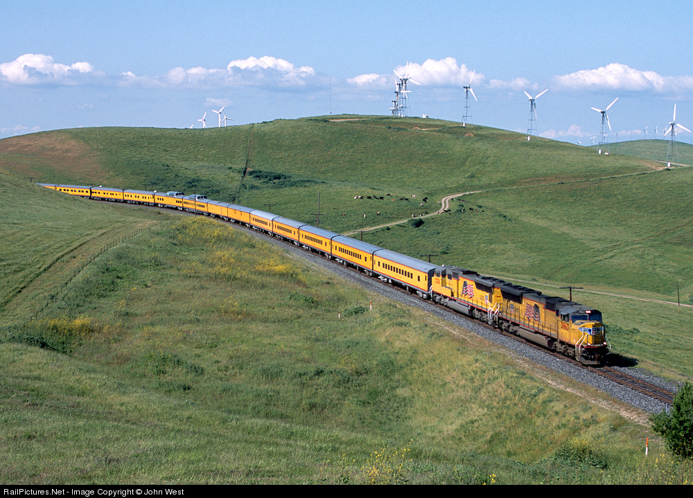 Each spring the UP often deadheads passenger equipment to Omaha that has been stored for the winter in Oakland. The Omaha winters are tough on paint because the paint and the metal react to cold differently, causing premature paint deterioration. These DH movements have occasionally been used as an orientation trip to allow employees from Omaha to see a bit of the railroad. Here is one such move going east over Altamont Pass on the former WP. Just above the units you can see the abandoned right of way of the parallel SP line, which was part of the first transcontinental railroad, but became less important and eventually expendable when the SP built a more direct line from Sacramento to Oakland (the so-called CalP). The consist is interesting because the power cars are behind the coaches, suggesting the coaches were empty while the more upscale cars on the rear of the train were the ones occupied.