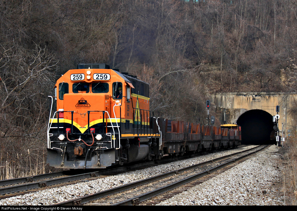 | After a long and slow climb up hill from ET, BMEX 259 starts down grade with its small train of slabs after exiting the 1919 build Dravosburg tunnel. After testing on the URR and also at ET the 259 was sent back to Brookville and was recently sold off to the Central California Traction company. |