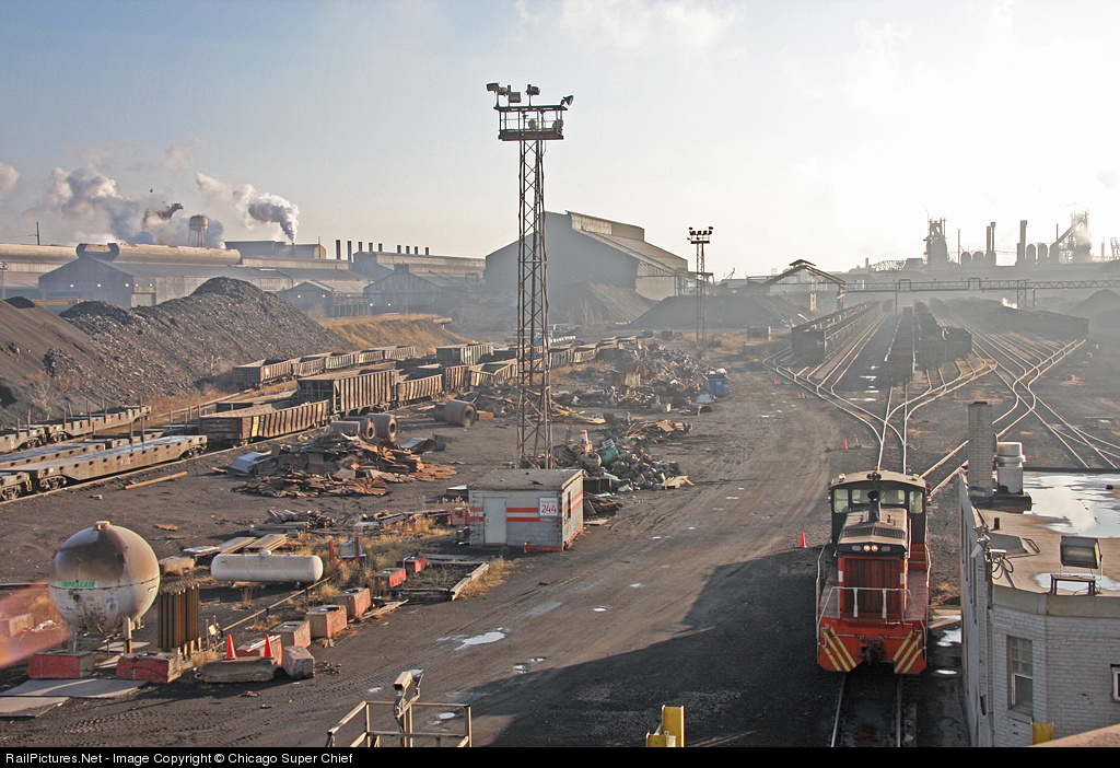 ArcelorMittal #1012 and a traction calf (behind, not visible) sit near the station house, preparing for a morning of switching. A section of the western expanse of the massive ArcelorMittal complex unfolds behind it, including an active yard, and apparently a repair or boneyard.