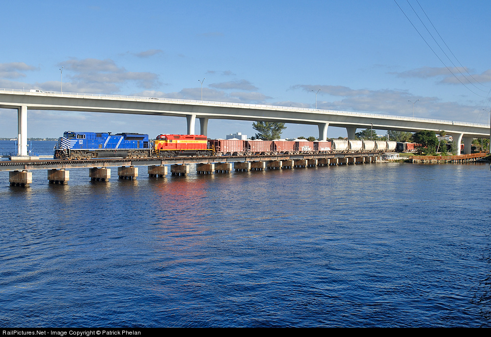 Northbound FEC train #202 crosses the Stuart Bridge on its trek to Jacksonville from Miami with FEC #714 second out in the new "heritage" FEC paint scheme.