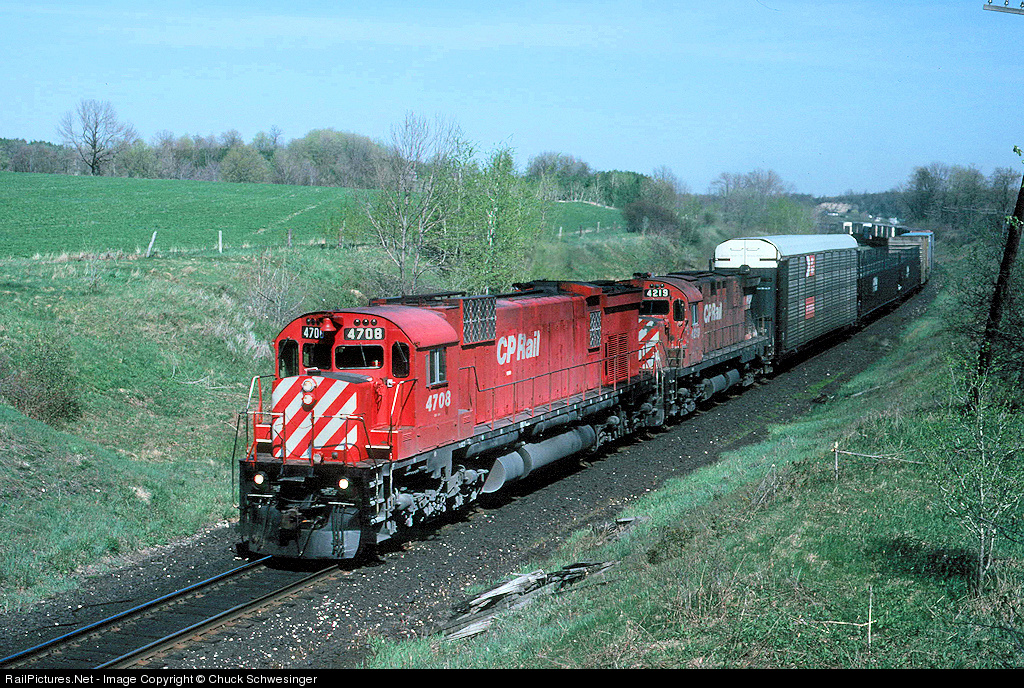 | CP train 923 with 4708 and 4219 pass through a cut west of Zorra. The big M's were nearing the end of their career on CP. They were retired by the end of the year. Replaced with leased EMD's the big M's just didn't go quietly as a traffic surge required about half of them to be placed back in service by the spring of 94. Most were then retired as they suffered major failures and the final ones were retired in 1995. 4708 was not one of the lucky ones to get called back to service as it failed on its final trip in Dec. 1993 and the engine block sustained freeze damage somewhere between Schreiber and Chapleau. |