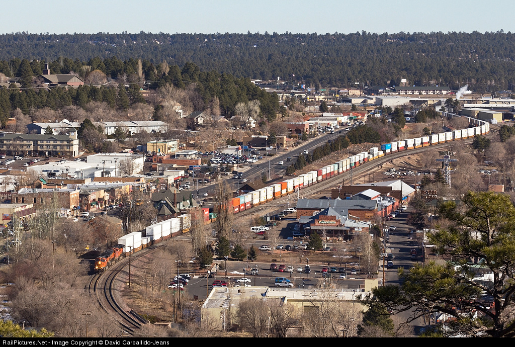 Looking down from the Lowell Observatory over down town Flagstaff, BNSF 7521 moves up the Arizona Divide.