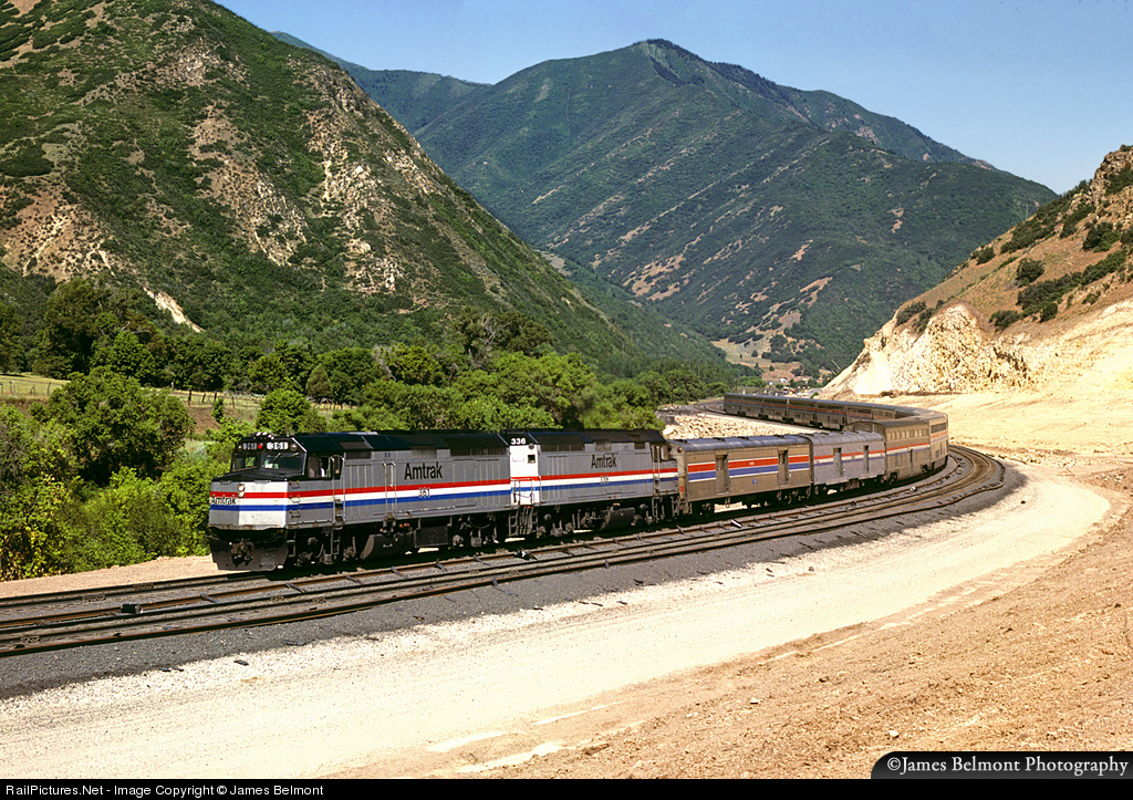 | The first eastbound run of Amtrak's California Zephyr via the D&RGW enters the new Thistle line relocation in Spanish Fork Canyon. This vantage point has changed greatly in the past 29 years as vegetation has grown up along the right of way obscuring the track. Local railfans named this spot 'Vern Jeffers Curve' to honor a good friend and local Utah railroad historian who passed away in 1997. |